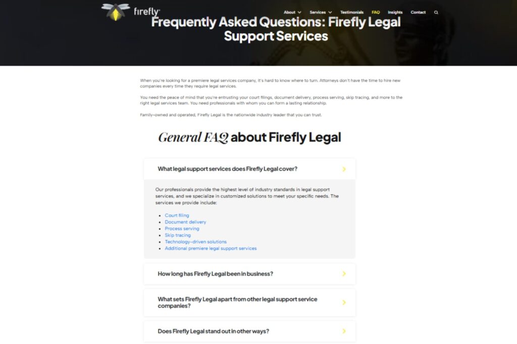 Yeah. So you have an FAQ page, which is a set of questions broken down into sections on pricing and other topics. You also have various services pages that each include FAQs at the bottom. So, for example, on the process serving page for just the general services page, you have, “Can a process server talk to my neighbors? Can a process server walk around your property? Do you have to answer process servers’ questions? What happens if a process server can’t find you? How do process servers find people?”