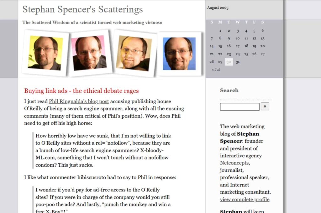 Yeah, so that was 2004, and I was a real laggard in that regard. So if you’re seeing the screen here, that is the first iteration of my brand, personal brand website. It was just a blog, a WordPress blog. And then after I sold the company in 2010, I left the acquiring company about eight months later. Then I invested in a redesign, but yeah, I blogged pretty regularly. That was the thing back then, 2004, I was an early blogger. That wasn’t as popular back then. So I kept that up, and now I don’t blog so much, hardly ever, but I do.
