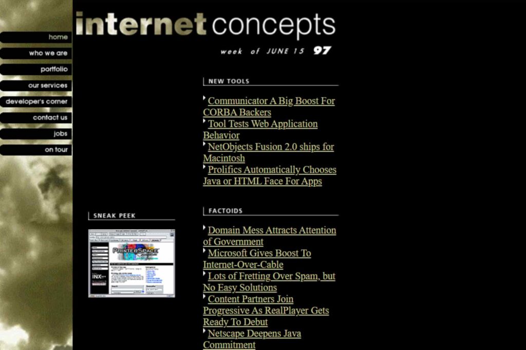 Yeah, I called it Internet Concepts, but it was netconcepts.com, 1995. Yeah. So this is actually a version from a couple of years into it. We did have a designer on the team, and he designed it. So we had much smaller screen resolutions back in the day. So there’s a lot of blank space, as you can see, if you’re looking at the video, the listener/viewer.