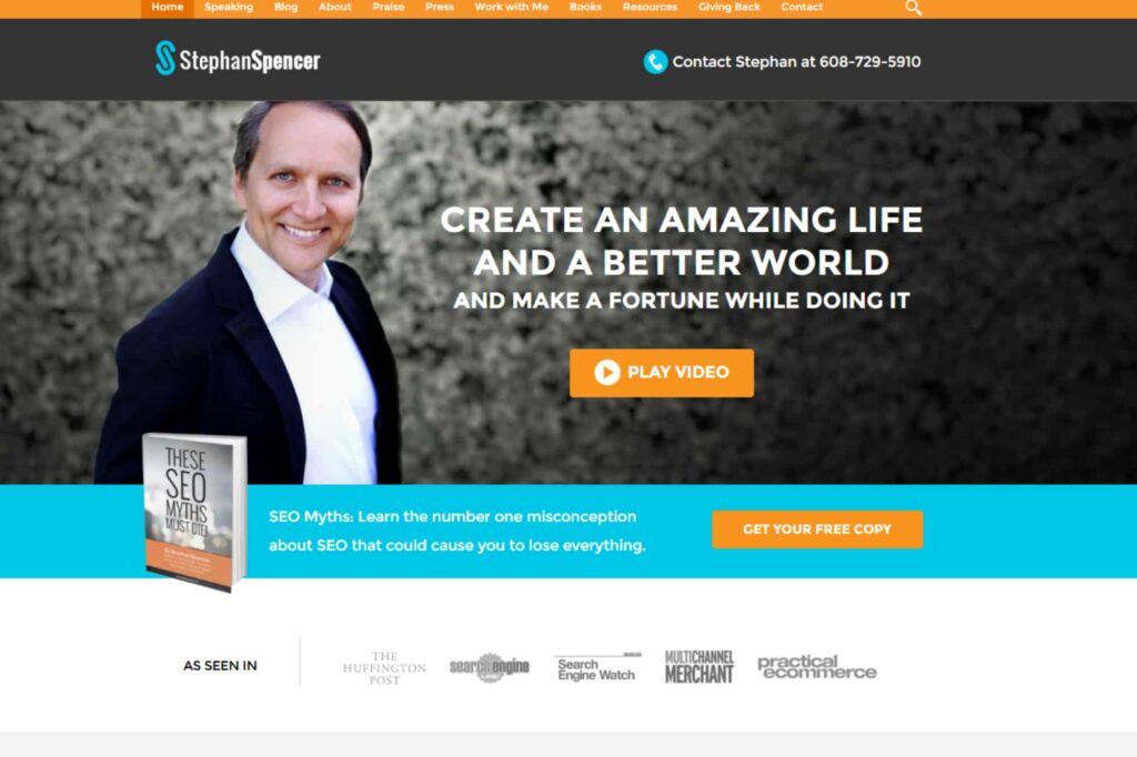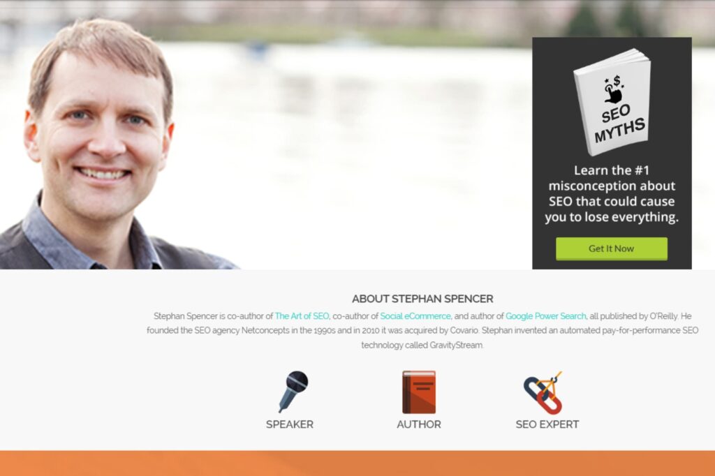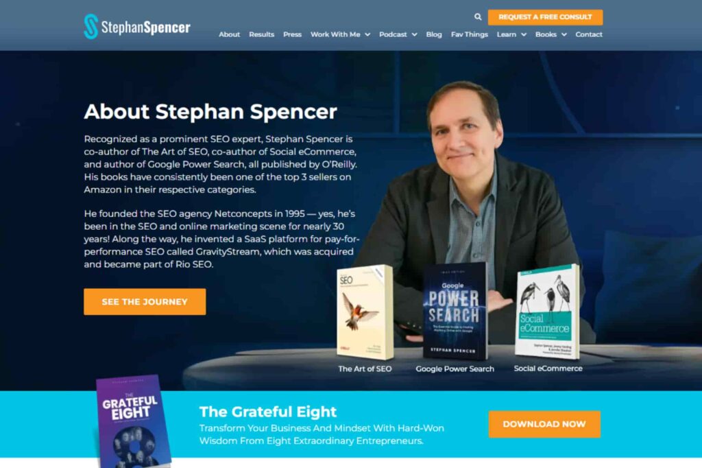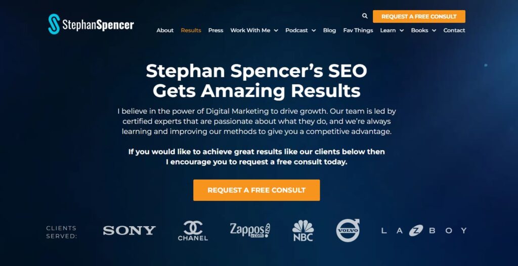 And so this is your new one, and it does have a good intro, obviously about Stephan Spencer, good for SEO, right? In the big, large font. Then, yeah, this is a position in peace. And then you go into, obviously, you’re gonna request a consult call to action. We haven’t talked about call to actions, but they’re strategically placed throughout this website. But then, yeah.