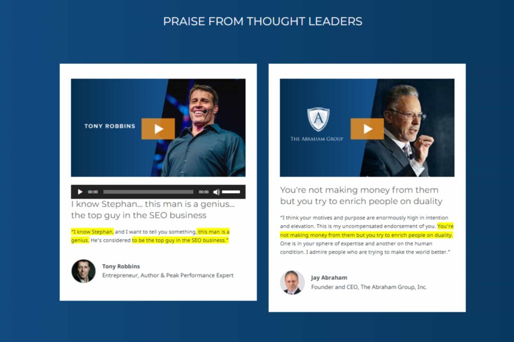 Like, we only updated it again this year, essentially. Right. And so, yeah, this, and you build a lot of brand authority on this website. You put all of your social proof with people like Tony Robbins and Jay Abraham saying awesome things about you, and testimonials from clients and case studies.