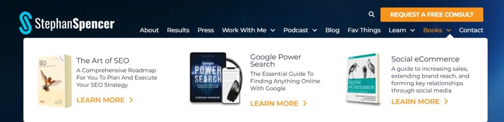 And then, if they want, they could go to the Art of SEO website at artofseo.com. Yeah, suppose you send them off-site too quickly, even if it’s another site that you own. In that case, you take a risk because it’s now a jarring experience to end up on a completely different website, with different branding, nav structure, site structure, et cetera. So we try to keep people on as long as possible. But yeah, I love that mega-nav with the imagery: when you hover over books, you see pictures of the books; when you hover over the podcast, you see pictures of the podcast. Now you see the two podcast covers. Good stuff.