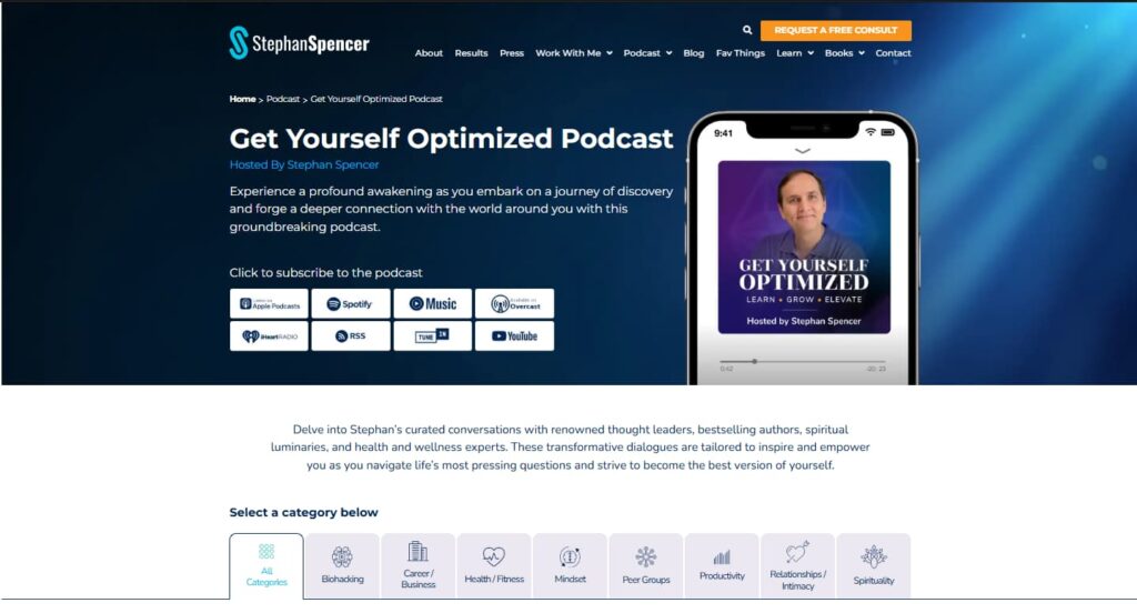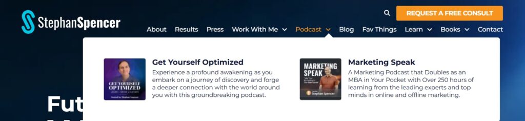 They may not even know he has a Get Yourself Optimized podcast. So there may be a major disconnect if we just take people from the top nav, mega menu feature section, to the actual podcast. Stephan has what we call a bridging page. So it’s still on the Stephan Spencer website, but it’s an introduction, and it’s pretty much the same as what you would see on the podcast page. It accepts and displays all the categories, and it just builds more trust when you do it this way, rather than taking people directly off the site. Now, he’ll show all of the featured episodes. He’s got all the categories at the top. And then, if you click on any of these, it will take you to that external website. And I think it’s just a really smart approach before you take them there to really show the bridging page for the two different brands, Stephan Spencer and Get Yourself Optimized.