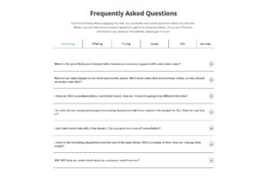 Yeah. And, we’ll wrap up shortly. It’s up to you how long you want to go for, but I want to talk about the frequently asked questions, since you put a lot of effort into them as well. Like, if you’re watching this, have a look at the segment that runs horizontally across the top of the frequently asked questions. And then you have a whole bunch for each, but it’s really nicely organized, rather than just having it all on one big, long, expanded page, which would be really confusing for visitors. Think about putting it into sections like pricing, offering consulting, scope, etc. I think it’s just so much easier for the viewer to digest.