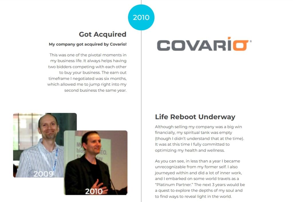 Yeah, because people want to know, like and trust you, and you’ve got to highlight your story of struggle, the hero’s journey, trials and tribulations and not just your Instagram-ready success moments, but some of the crazy wild ride as well. If you look back to 2009, 2010, there’s a before-and-after there: the 2009 photo and the 2010 photo, juxtaposed, showing me before and after a huge life reboot, where I got like Lasik and a hair transplant and changed my diet. I started working out, and I became unrecognizable from the previous version of me to the point where I would go to conferences to speak. If I didn’t have the badge on me or whatever, people wouldn’t recognize me.