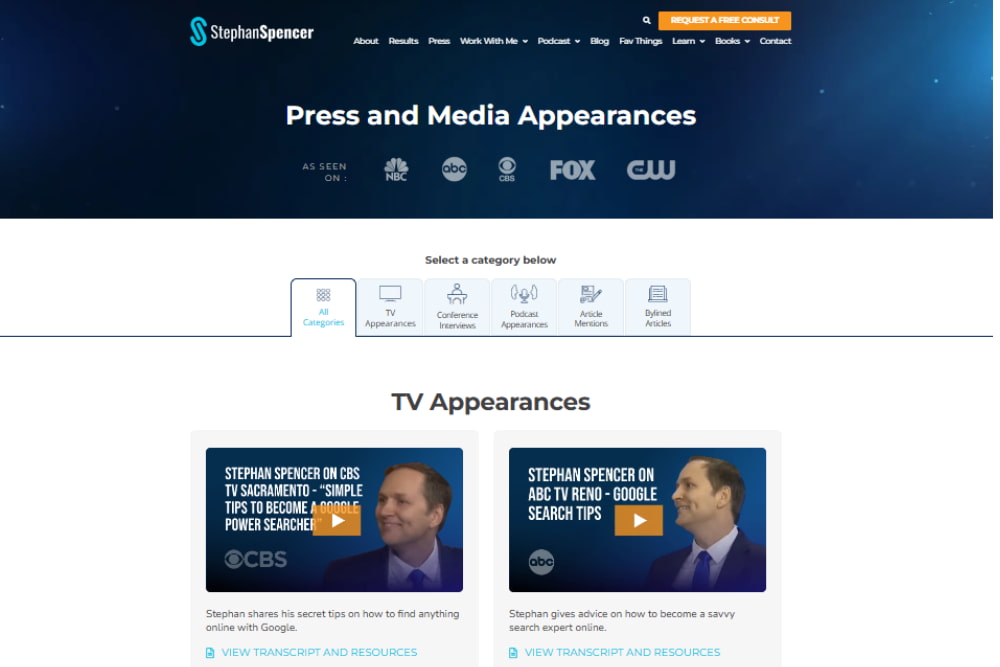Exactly. And obviously, you have press in the top nav as well, which is really important, you know, to showcase that authority. And when you go there on the press page, you’ve got a beautiful section at the top of the page, you’ve got press and media appearances as seen on the big ones, you know, household names, but underneath that, you’ve got a selected category below. So you’ve got TV appearances, conference interviews, podcast appearances, article mentions, byline articles, and all of these, when pressed, will anchor-link down to that section of the page. So whether they press it or not, or they just scroll, they see the sheer volume of places that you’ve been mentioned. So it’s yeah, super impressive. We just make it easier by having those tabs so people can get to the relevant things quickly if they want.