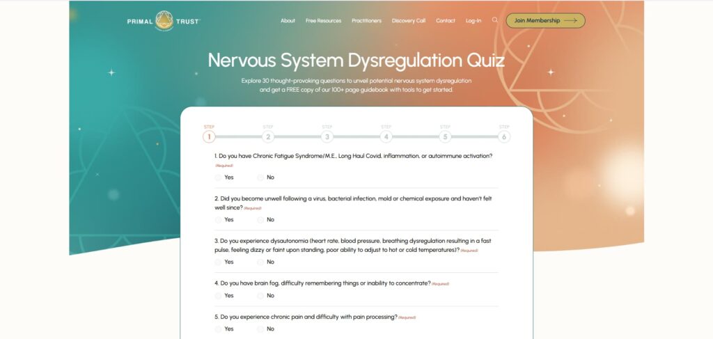 Okay, so this is a really cool pop-up. I think it’s really attractive, really elegant, really compelling. It offers a great free download, which is a wonderful guide. This ebook, available for free, then invites you to take the quiz. So, there’s actually a double whammy. You’re getting two things at once. You’re getting the quiz and its results; then you’ll also receive this eBook, which explains how healing occurs, and it’s well-researched and well-organized. It’s over 100 pages. It’s really compelling. You’ll receive a great free gift simply by taking a short quiz. The headline here is, is nervous system dysregulation behind your chronic symptoms? Anything you want to add here? Greg,