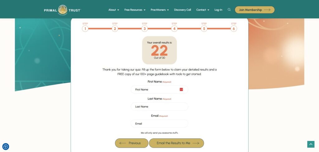 Yeah, so now you’re getting a score overall rewards results of four out of 30. If you want the guidebook, you need to provide your first name and last name, as well as your email address. But yeah, it’s not like you’re going to just bail at this point because you didn’t. You invested the time in filling out the questionnaire, but you haven’t supplied your email address yet, and you feel like you haven’t received all the details. You’ve just received a score, but you haven’t received the detailed results yet. You didn’t get the guidebook. So it’s a no-brainer. You’ve already invested X amount of time filling this out. You might as well do the last little step here and give your email address.