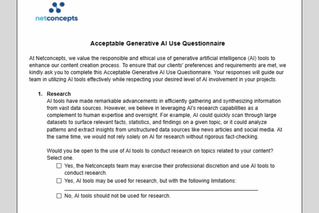 Then we give clients three options: Yes, Netconcepts may exercise their professional discretion and use AI tools to conduct research. Or yes, but with specific limitations they specify. Or no, AI tools should not be used for research.