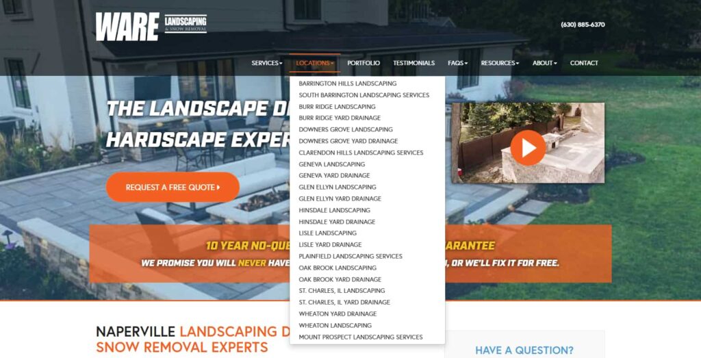 For example, Naperville landscaping, Naperville drainage, and Naperville snow removal. Those are really crucial pages to have. And if you’re a law firm, or you are a plumber or electrician or any other kind of local business, and you serve multiple suburbs, multiple towns in the area, you really need to do this because that will help you to rank for those combinations of keywords, and not just like trying to be everything to everybody with the general drainage page.