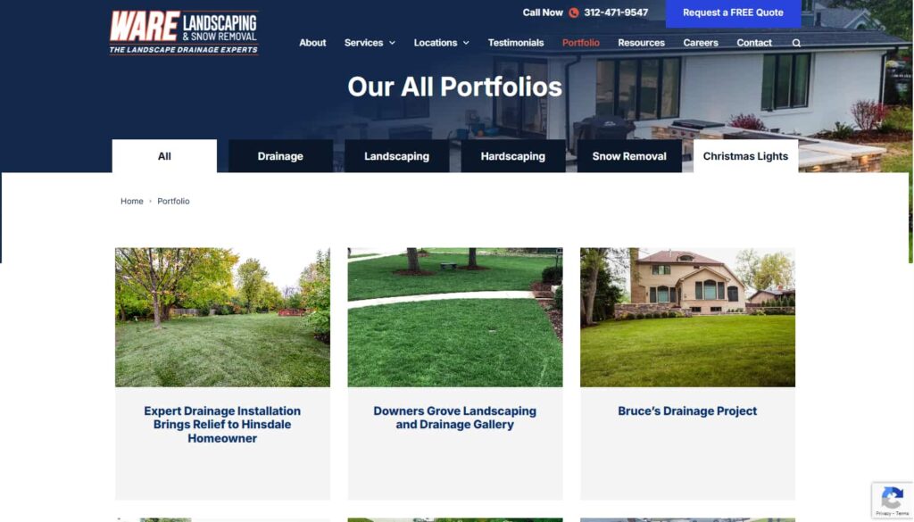 I was just trying to find the lead magnet, but yeah. Okay, so then this is also smart. This is from your team. We have all of the testimonials on the testimonials page, so you can just see a big wall of them. But then we also have them separated into their service, so people just looking for testimonials about drainage can go to the drainage tab and read those. So, it’s just a much better user experience for people looking for that. And then just take it to the next level. We’ve got the same categorization on the portfolio page for all of their past projects; once again, it’s super helpful just to get to drainage or landscaping, et cetera.
