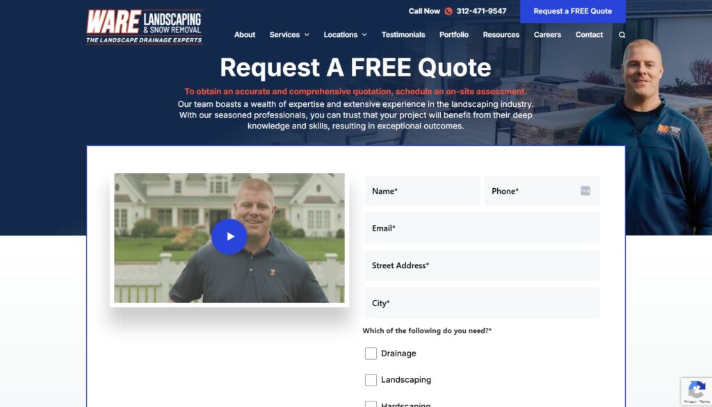 Yep, there you go. Yeah. So, yeah, it’s just next level, the whole website. And then, finally, they gotta request a quote page. It has a nice video here, which is really good. Actually, it makes these fields, phone numbers, and street addresses mandatory because they also attract better-quality leads. Okay, so, yeah, keep that in mind. If you’re a service business, you want better leads.