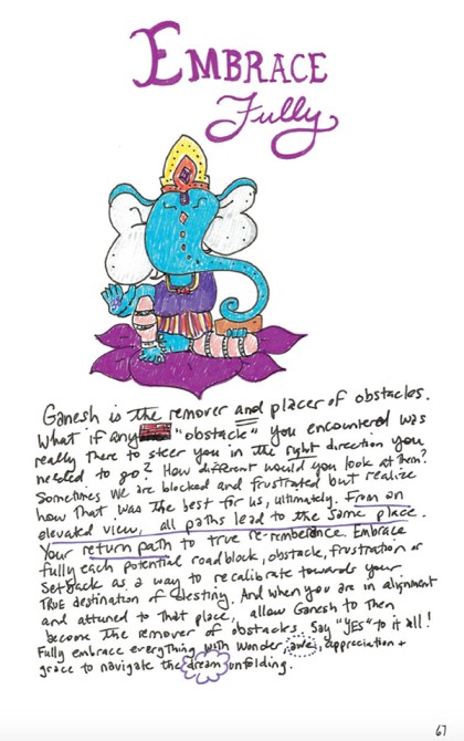 Ultimately, from an elevated view, all paths lead to the same place. Your return path to true remembrance, embrace fully each potential roadblock, obstacle, frustration, or setback as a way to re-calibrate towards your true destination of destiny. And when you’re in alignment and attuned to that place, allow Ganesha then become the remover of obstacles. Say yes, to it all. Fully embrace everything with wonder, awe, appreciation, grace to navigate the dream unfolding.”